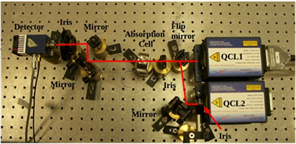 The experimental apparatus is shown below. Two QCLs, covering the ranges 1205-1310 and 1335-1520 cm-1, are alternately sent along the same optical path, across an absorption cell, 2 mm long, filled of the proper sample of dioxins/furans dissolved in CCl4.